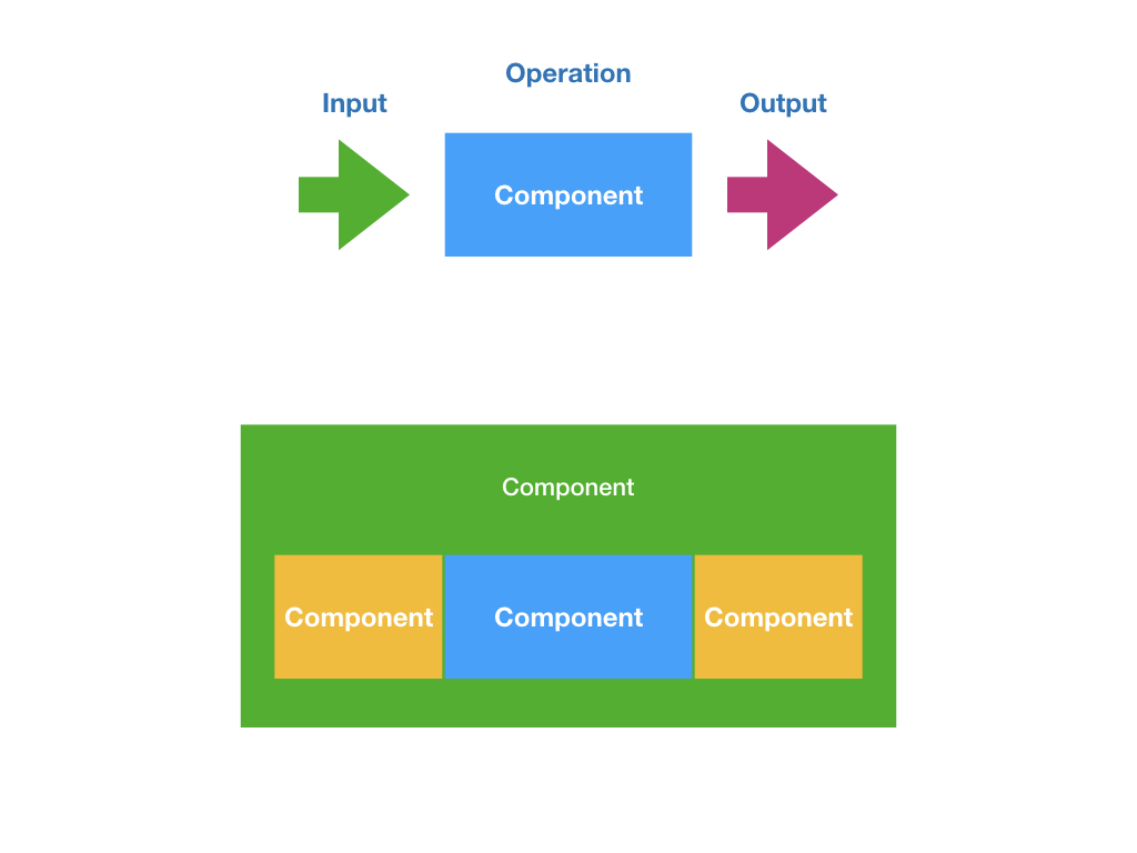 Component とは、input (入力) を受け取って、それを元に Operation (なんらかの操作) をした結果を、Output (出力) する部品のこと。